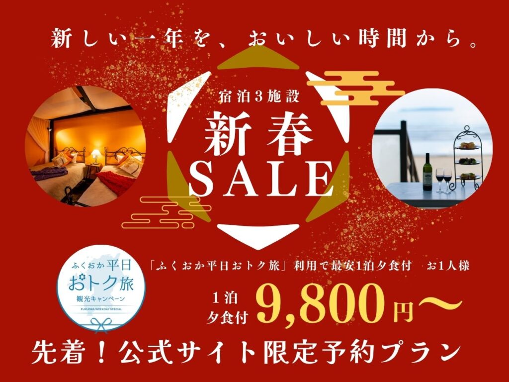 8棟のコテージに手ぶらで楽しめるアウトドアキャンプエリアがある宿泊エリア。博多から30分、海が見える絶景リゾートステイを楽しんで。